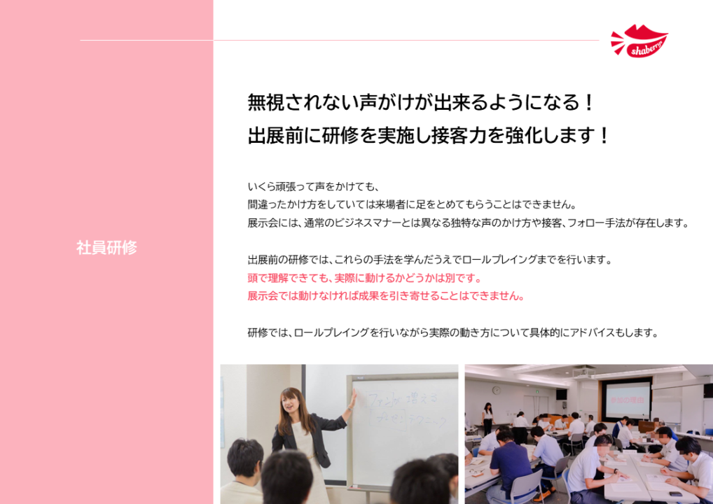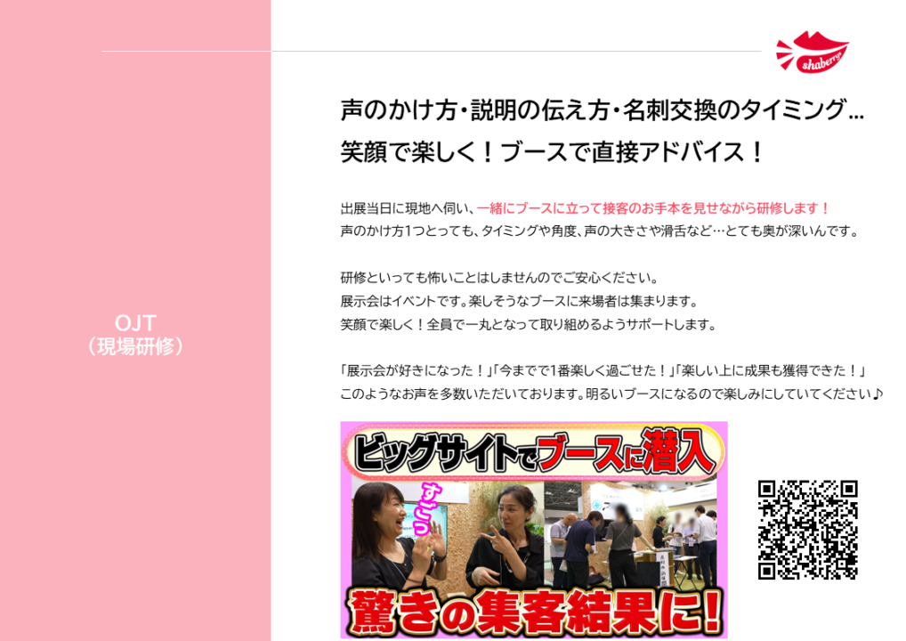 ブースの雰囲気を明るく、社員の皆様の士気を高め成果に繋がるようブースで研修を行います。