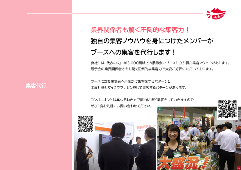 弊社独自のノウハウで、来場者への声がけを代行!ブースへの集客にお悩みの方、シャベリーズの代行チームにお任せください。